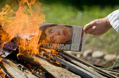 Sudegintųjų sąrašas - taigi tie politikai, kurių nuotraukos simboliniame vu du akte buvo sudeginti kažkokio ten laužo šviesoje, kad būtų paversti pelenais ir nustotų egzistuot. Šitą renginį surengė Tautininkų sąjunga, kuri šitaip parodė, koksai likimas laukia tų atvaizdų.