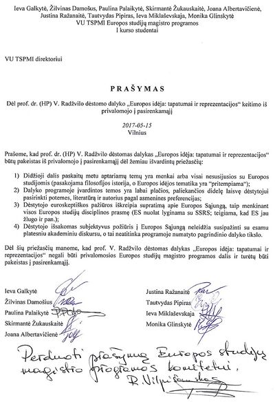 Taigi, iškart po to, kai daugiau nei pusę paskaitų ir seminarų be jokių pateisinamų priežasčių praleidusi TSPMI komjaunimo kuopelės seniūnė Ieva suprato, kad egzamino metu jai gali būti riesta, buvo nutarta suagituoti ideologiškai susipratusį jaunimą sukurpti skundą-donosą ant profesoriaus Radžvilo, kaip ideologiškai nepatikimo kadro, katras įžūliai negerbia Europos Sąjungos beigi turi savo piktą nuomonę apie Šv.Europos Komisiją ir netgi jos Pirmininką, patį Žaną Klodą Junkerį!